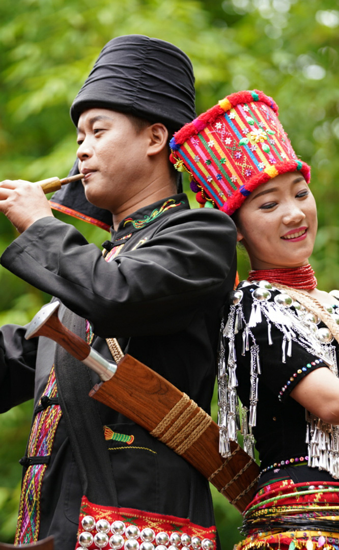 德昂族人口約1.7萬,主要分布在德宏州和保山市的潞西、梁河、瑞麗、隴川、隆陽等縣區。民居多為草排覆頂竹木結構的干欄式建筑,眼前的德昂村建筑納入了能容納數十人居住的德昂大房子,氈帽頂的小房子,還有頗具浪漫色彩的大公房、小公房……還建有“龍陽塔”標志及佛教奘房、佛塔。德昂族民間普遍信奉南傳佛教,民俗活動與佛事活動關聯緊密。潑水節(jié)、開門節(jié)、關門節(jié)是重大節(jié)日。德昂族服飾色彩豐富,口頭文學特別是民歌創(chuàng)作活動...